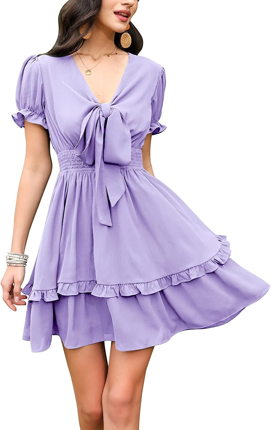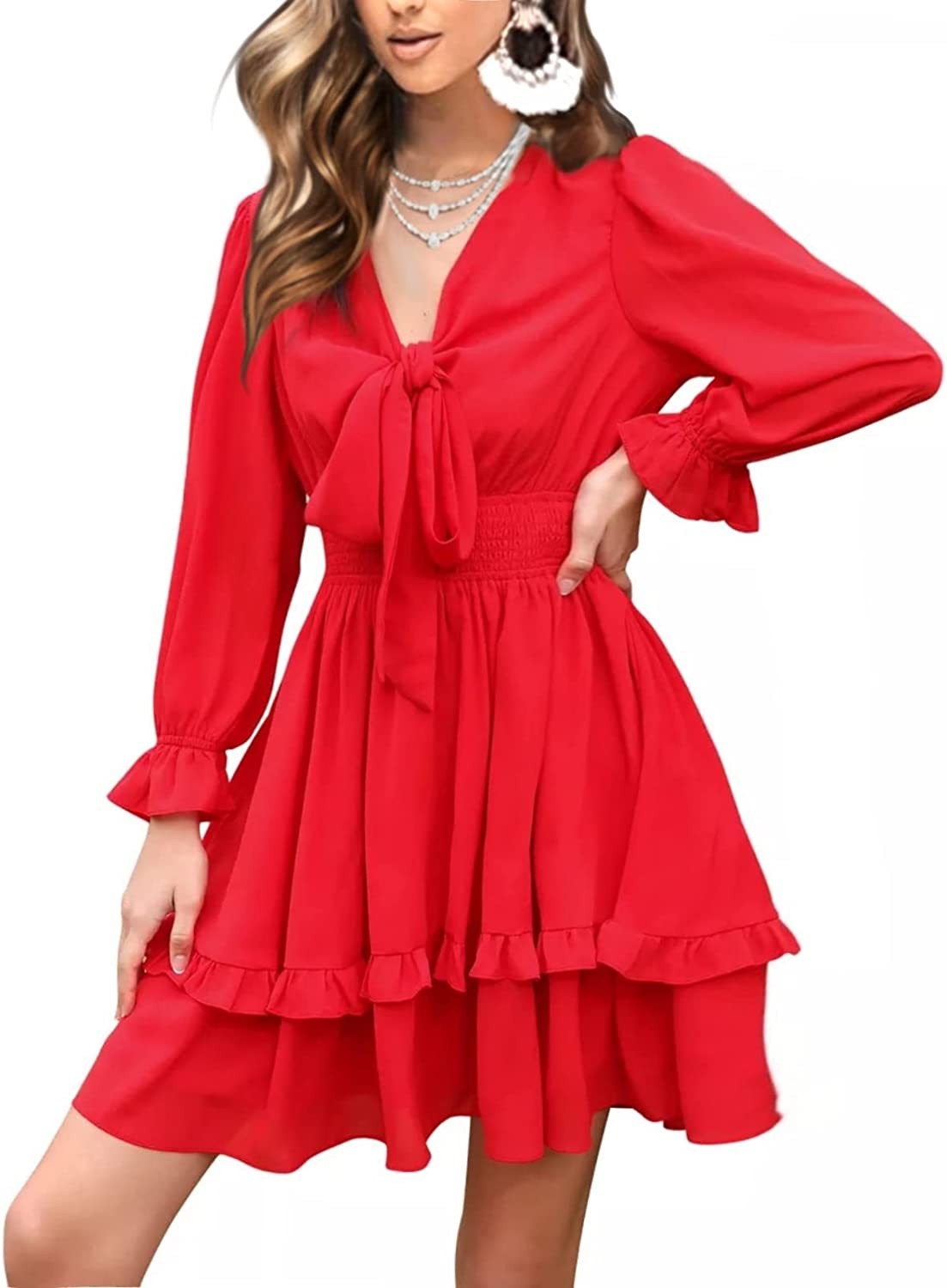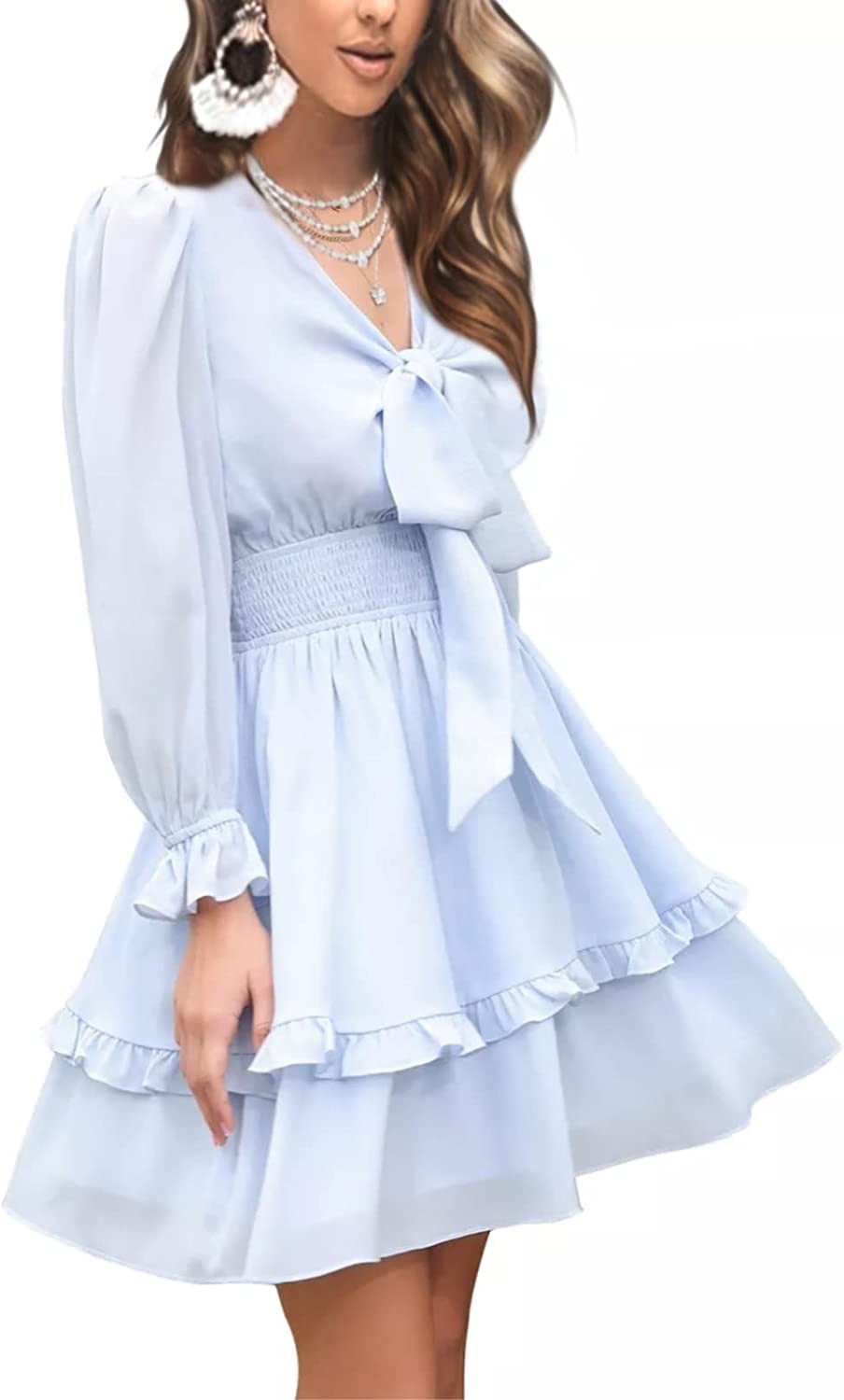 EXLURA Women Tie Front Elastic Waist Tiered Ruffle Layer Floral Balloon Long Sle