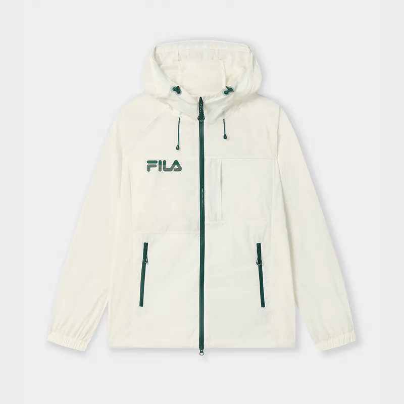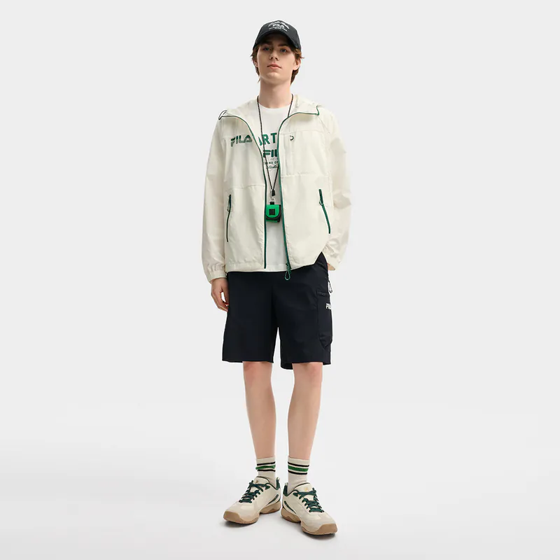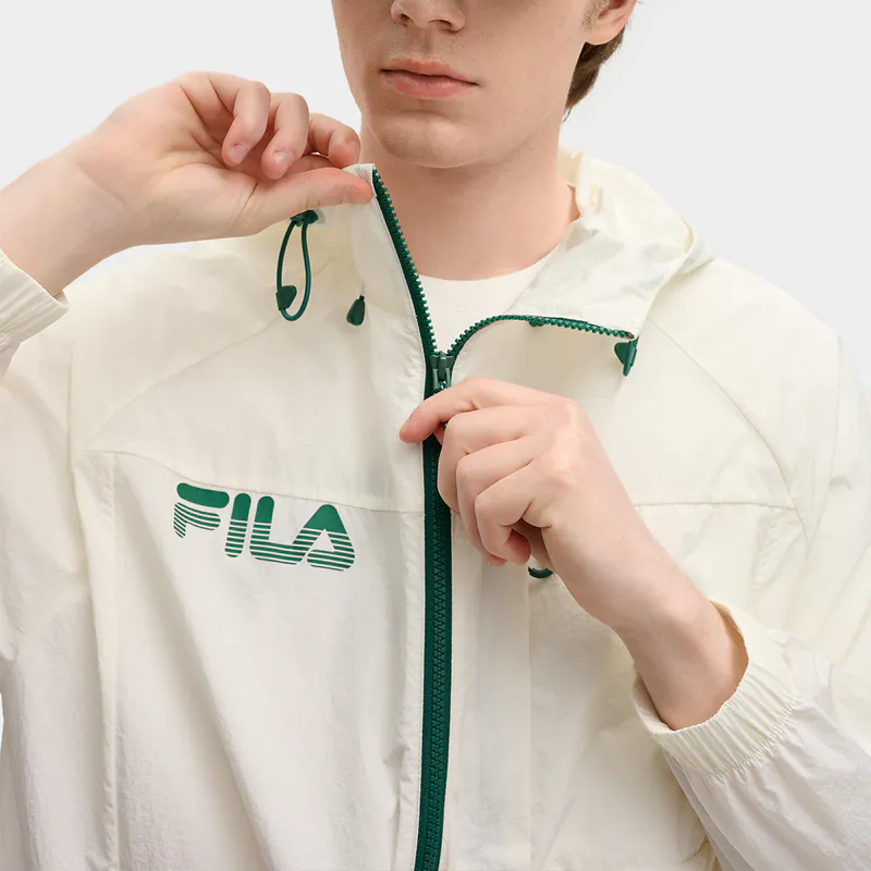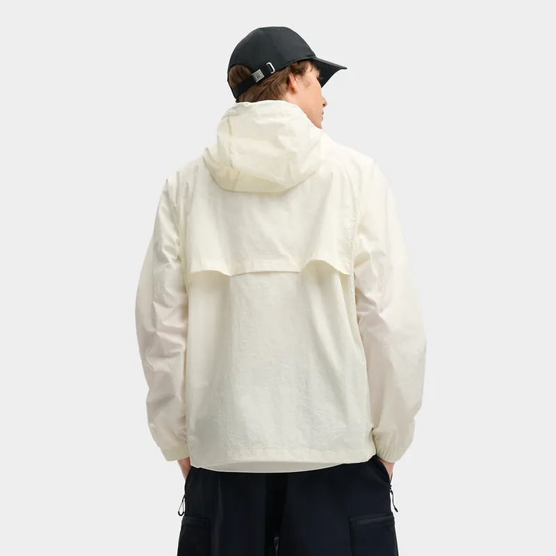 - Woven sun protection hooded jacket, matte slightly thick three-dimensional silicone print on the chest; accordion pleats on the back; green zipper details.